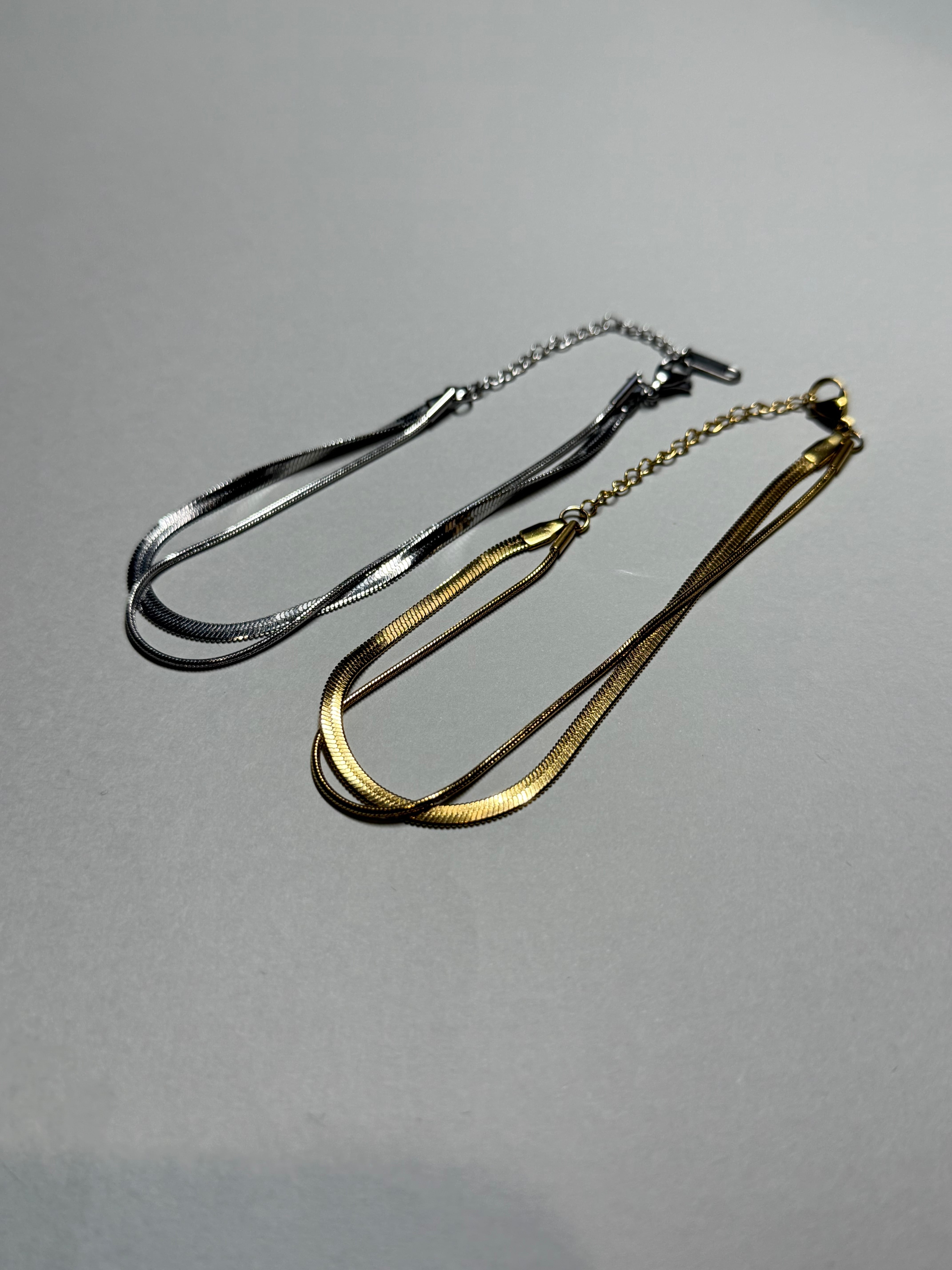 スネークチェーンの重ね付け風アンクレットです。 素材はサージカルステンレス(316L)を使用しており、水や汗に強く錆びにくい素材なのでお風呂でも付けっぱなしでOKです。また、お肌にも優しいアレルギー対応の素材です。 ゴールドカラーはK18GPとなります。PVDコーティング(真空鍍金)という特殊な製法でお作りしているため通常の鍍金処理よりも剥がれにくく、耐食性、耐水性に優れています。